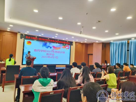 4月7日下午,食品与制药工程学院在明科楼1楼会议室举行大学生志愿服务西部计划宣讲会,特别邀请我校服务于新疆的西部计划志愿者、2021届毕业生何明城、钟慧欣、马小金进行宣讲,学院党委副书记李泽庆、2023届毕业生代表、辅导员及对西部计划感兴趣的非毕业生参加会议。