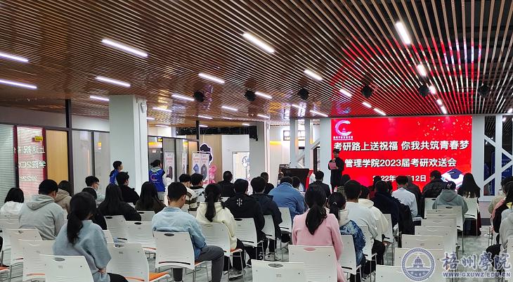 为帮助学院考研学子坚定目标、调整心态、树立信心。管理学院于12月12日在体育馆负一楼邑谷中心举办了2023届考研学生欢送会。管理学院党委书记冀宁、副书记陈兴,副院长赵虹,各教研室教师代表和即将参加考研的同学们参加欢送会。
