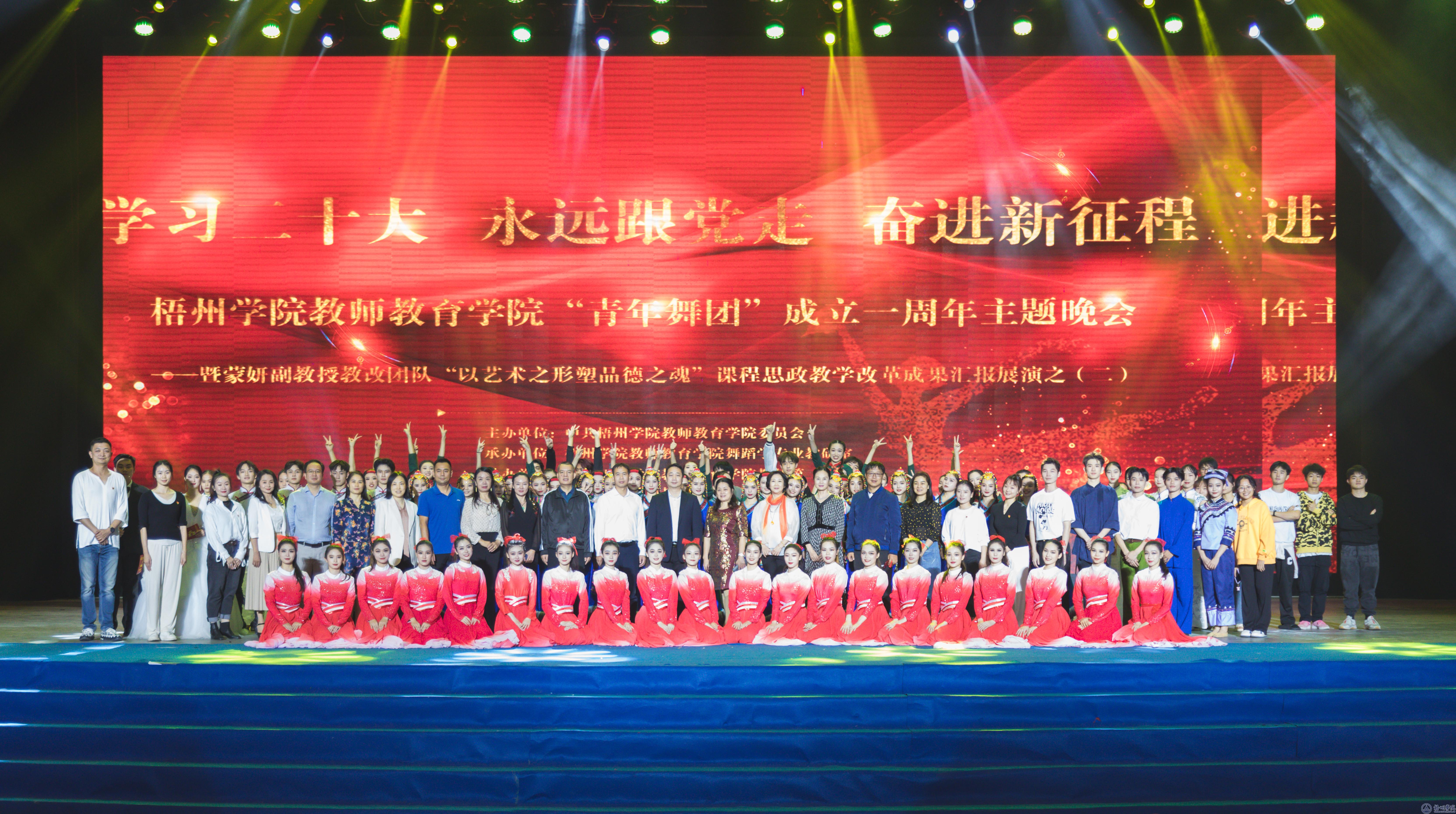 为庆祝党的二十大胜利召开,贯彻习近平总书记在庆祝中国共产主义青年团成立100周年大会上讲话精神,彰显新时代大学生积极奋进的精神风貌,落实立德树人根本任务,推进课程思政建设。11月22日晚,教师教育学院主办的“学习二十大 永远跟党走 奋进新征程”教师教育学院“青年舞团”成立一周年主题晚会——暨蒙妍副教授教改团队“以艺术之形塑品德之魂”课程思政教学改革成果汇报展演之(二)在学校体育馆三楼成功举办。莅临晚会现场的有来自学校各单位、各部门及各二级学院的领导、老师们,以及梧州市文艺界的各位专家。