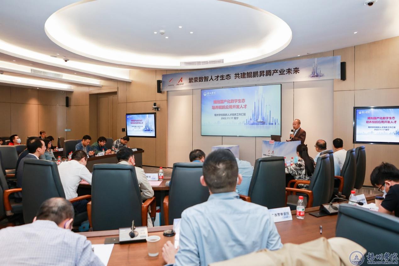 黄宏本副院长在会上作了题为《拥抱国产化数字生态 培养鲲鹏应用开发人才》的报告,向与会高校分享了梧州学院在鲲鹏人才培养方面所做的工作和取得的一些经验。
