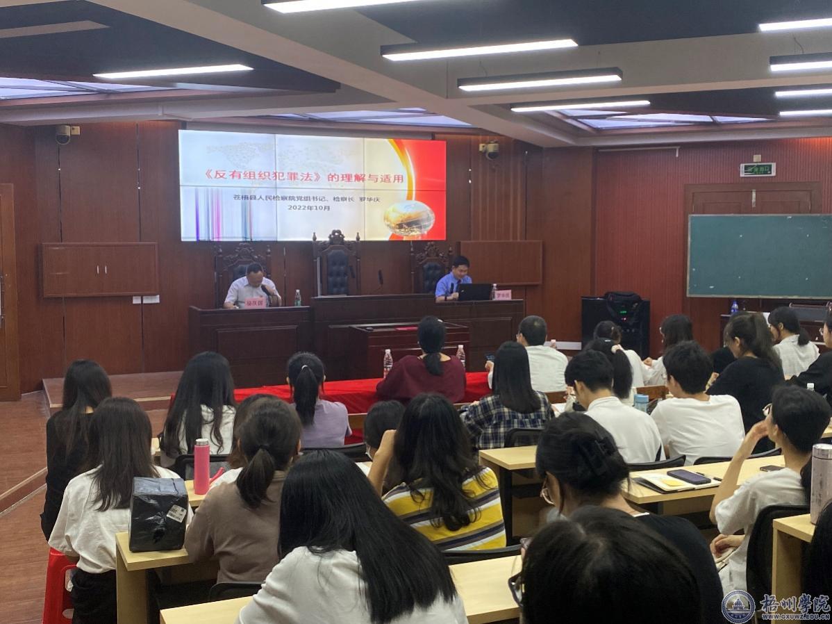 10月21日,法学院在明理楼模拟法庭举办“《反有组织犯罪法》的理解与适用”专题讲座,讲座由苍梧县人民检察院党组书记、检察长罗华庆主讲,法学院院长骆庆国教授主持,法学院2020级全体学生和部分专任教师聆听了讲座。
