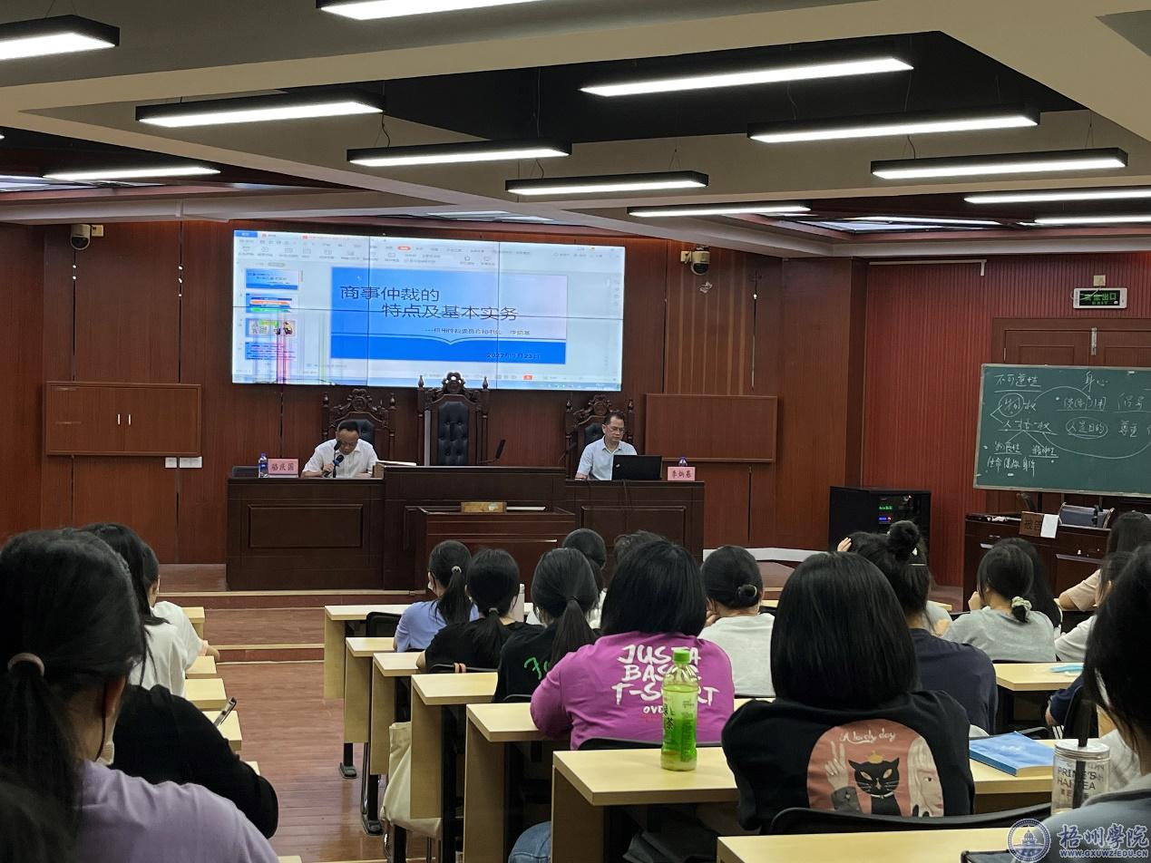 9月23日,梧州仲裁仲裁委员会副主任、梧州仲裁委员会秘书处秘书长李炳基在模拟法庭作《商事仲裁的特点及基本实务》的专题讲座。会议由法学院院长骆庆国主持,商学院辅导员和20级法学院专业同学参加了讲座。