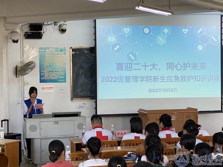 为了普及急救救援医学科普知识,提高学生自救和他救能力,管理学院于10月5日下午在明理楼开展应急救护知识讲座。讲座邀请了广西梧州红十字会医护人员进行讲解及现场操作,全体2022级学生参加知识讲座。