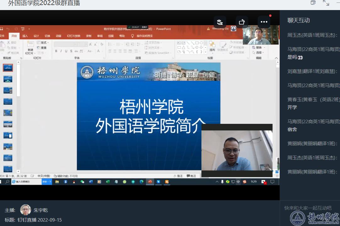 为切实做好2022级新生入学教育,更深入了解学院风采和专业特色,9月15日上午,外国语学院在钉钉举行了2022级新生线上见面会暨“开学第一课”。学院班子成员、学院各办公室主任、新生班主任、辅导员及2022级全体本科生参加。见面会由学院党委书记朱宇乾主持。