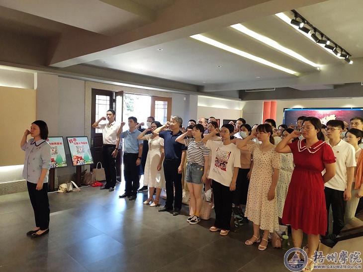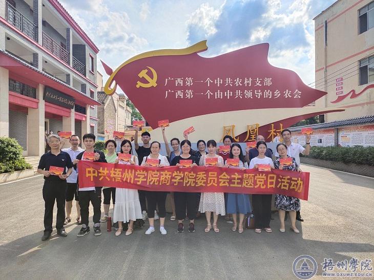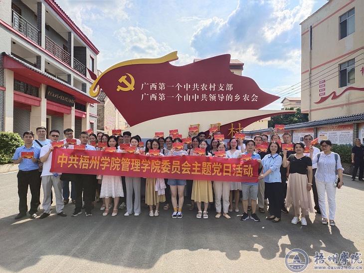 活动中,党员们来到梧州市万秀区夏郢镇凤凰村广西第一个农村党支部纪念馆,管理学院党委书记冀宁为党员们发放了政治生日贺卡,一起重温入党誓词。商学院党委副书记叶子琛为党员们介绍了梧州市党组织发展史,让大家接受了一次深刻的党史教育。