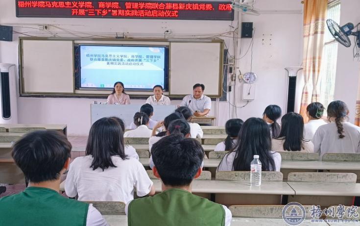 7月7日上午,我校马克思主义学院、商学院、管理学院联合藤县新庆镇在新庆中学多媒体教室举行了主题为“热心服务三农,倾情乡村振兴”的“三下乡”暑期实践活动的启动仪式。马克思主义学院党委副书记罗吉娟,新庆镇党委副书记、镇长梁玉媚和参加“三下乡”实践活动的学生参加启动仪式。仪式由新庆中学校长黄文瑞主持。