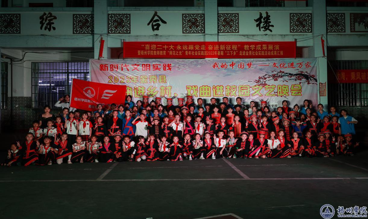 7月13日晚,“喜迎二十大、永远跟党走、奋进新征程”教学成果展演暨“师范之光”青年社会实践团2022年暑期“三下乡”走进金秀社会实践活动成果汇报在金秀县民族小学顺利举行。展演以手工作品展览和晚会歌舞展演为表现形式。其中,手工作品涵盖了红色党史、民族团结、青春励志等丰富题材,获得观展群众的一致肯定;晚会节目朗诵《我的祖国》、舞蹈《童心向党》、歌伴舞《灯火里的中国》、小组唱《不忘初心》、合唱《我和我的祖国》等精彩的文艺作品更收获了观众们的阵阵掌声。
