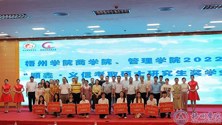 范生汝副校长,顺鑫、义信公司负责人,学生工作部(处)负责人、商学院、管理学院班子成员为两个学院考上研究生的9名学生颁发了顺鑫·义信奖学金。