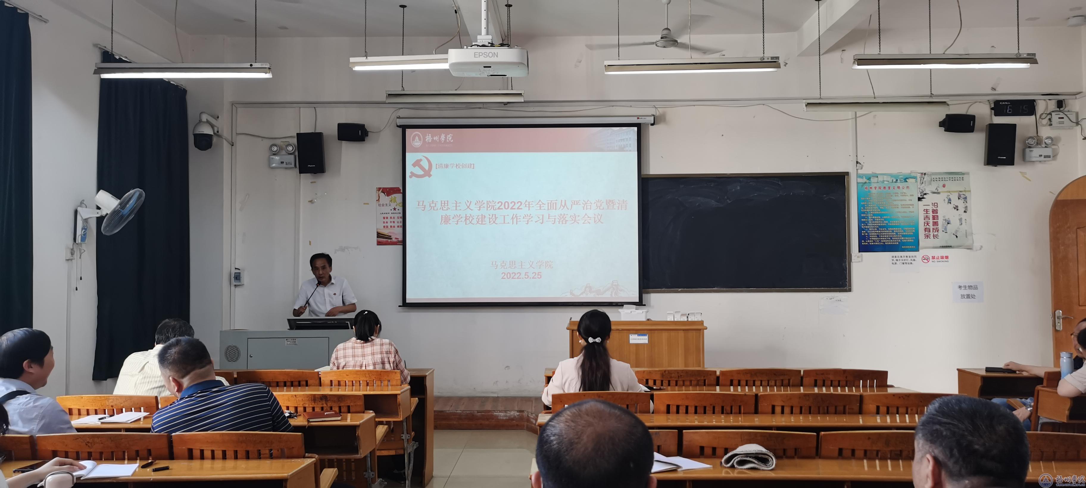 5月25日下午,马克思主义学院在明理楼M502教室召开2022年全面从严治党暨清廉学校建设工作学习与落实会议。学院党委书记张朝松主持会议,学院班子成员以及全体教师参加了此次会议。