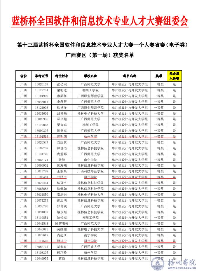 在第十三届蓝桥杯全国软件和信息技术专业人才大赛(广西赛区)中,电子与信息工程学院学子表现优异。在“单片机设计与开发大学组”“嵌入式设计与开发大学组”比赛科目中,共获得一等奖4项、二等奖6项、三等奖8项,获奖率达62%。