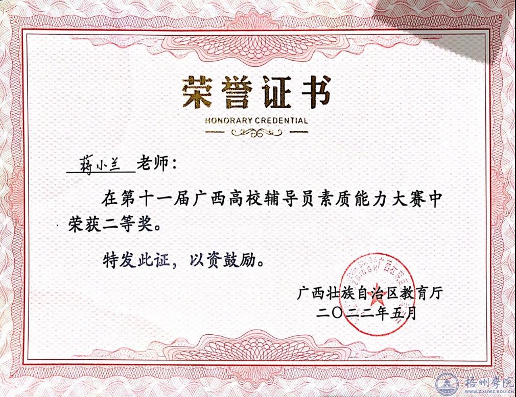 5月12日至14日,第十一届广西高校辅导员素质能力大赛在桂林市举办,我校辅导员蒋小兰老师荣获比赛二等奖。