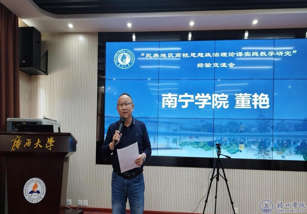 会议采用线上直播与线下会议相结合的方式进行。线上专题分享邀请了河北大学马克思主义学院柴素芳教授作了《高校思政课实践教学研究——以微电影教学为例》的报告。线上专题分享还邀请了《江苏高教》编辑部主编、编审作了《高校思政课实践教学应该正确处理的几对关系》的报告。“民族地区高校思想政治理论课实践教学经验交流会”线下有7所高校作了经验交流。朱红晖教授代表梧州学院作了思想政治理论课实践教学的经验分享,尹杰钦教授在会上对高校的经验分享作了点评。