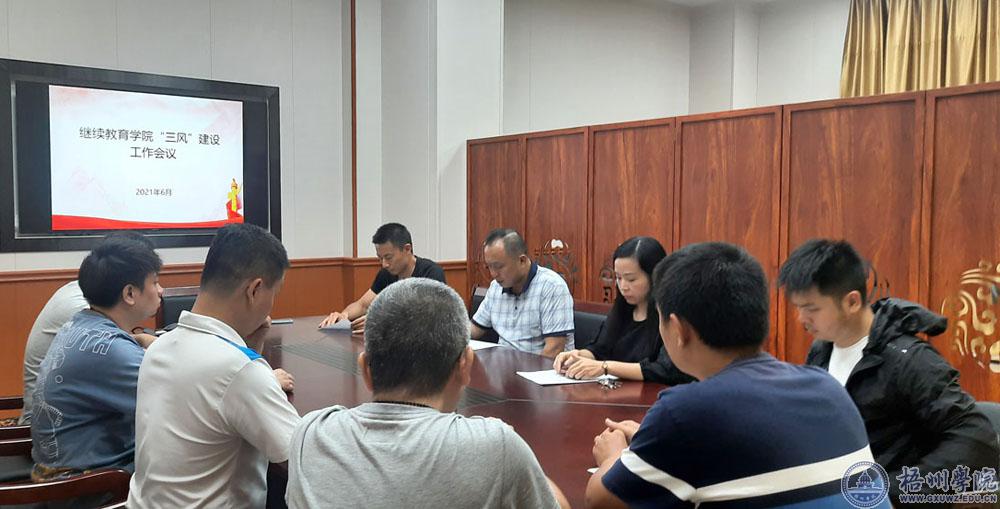 近日,继续教育学院召开全体职工会议,梁复明院长传达学习《梧州学院2021年“三风”建设年工作实施方案》,并结合学院实际,对深入贯彻学校开展“三风”建设年活动进行工作部署。梁复明指出,全体成员要深化思想认识,强化责任担当,进一步增强自觉性;坚持问题导向,准确把握“三风”建设的重点任务和要求,按照《梧州学院2021年“三风”建设年工作任务分解表》进行排查和整改落实;按照“转作风、提效能”要求,以科室为单位认真研讨重点任务,找难点,补不足,深化作风建设,确保“三风”建设活动取得实效,努力营造一个良好的育人环境。