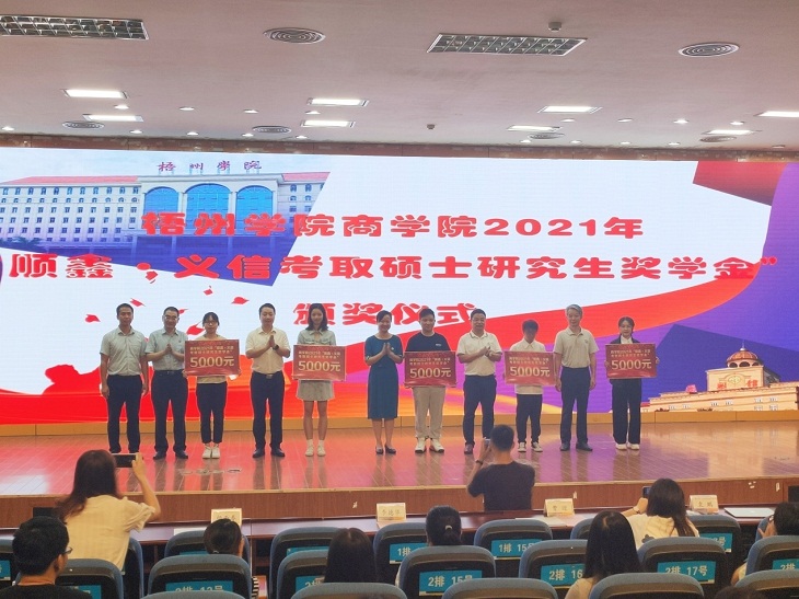 据悉,商学院今年共有5名应届毕业生分别考取了武汉科技大学、广西大学、广西师范大学的硕士研究生。“顺鑫·义信奖学金”是由梧州顺鑫网络科技有限公司、广西梧州义信建筑工程有限公司每年捐资五万元人民币在学校设立奖学金,用于奖励商学院当年考取硕士研究生的应届毕业生和低年级的优秀学生,鼓励学生提升学业水平。