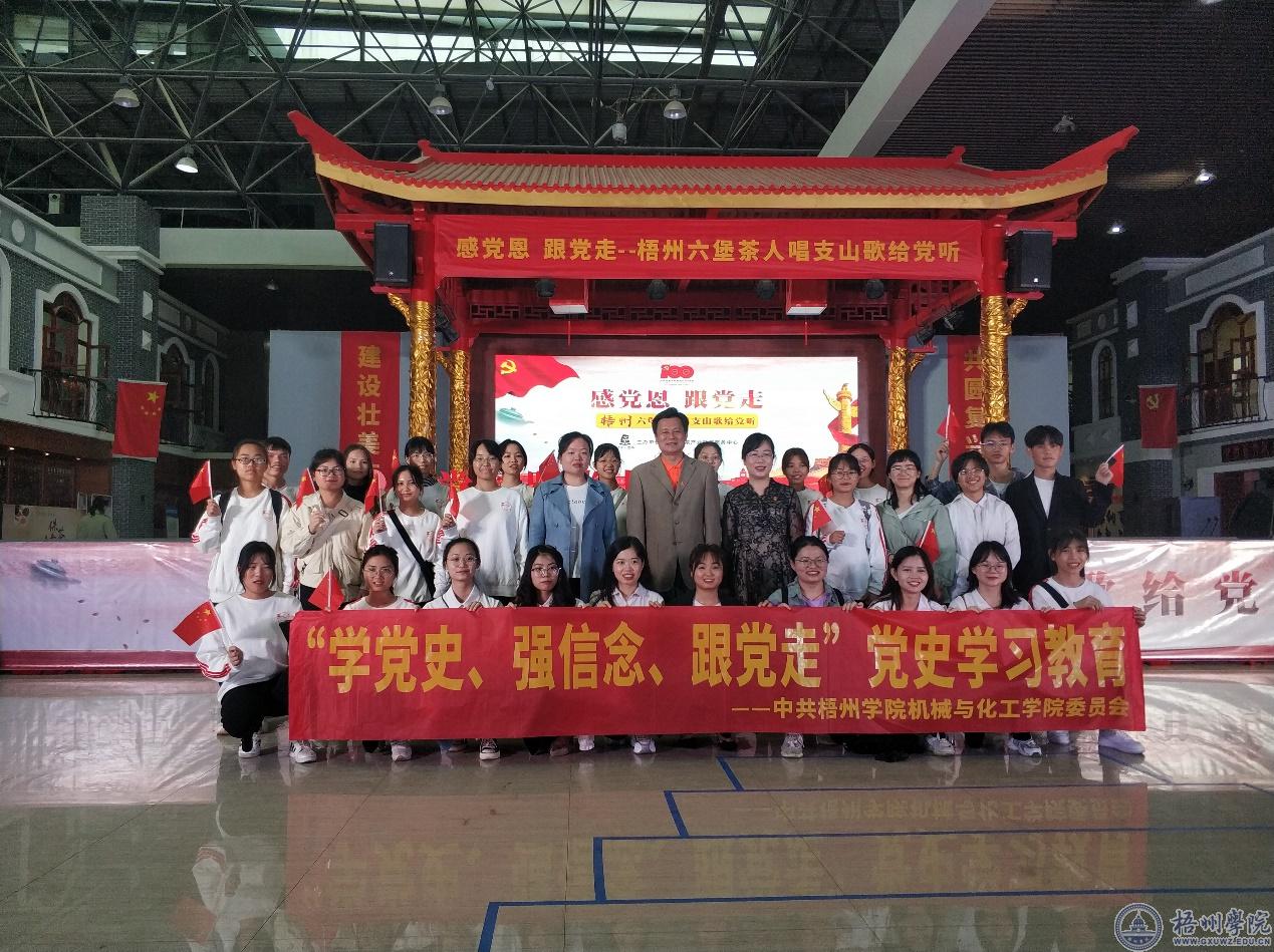 为深入学习习近平总书记关于党史学习教育的重要论述,从党的百年伟大奋斗历程中汲取前进的智慧和力量,4月26日上午,机化学院党委组织师生党团员代表参加梧州市茶产业发展服务中心组织开展的“感党恩、跟党走——梧州六堡茶人唱支山歌给党听”联合党日活动。