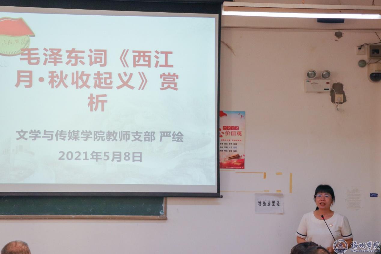 活动中,教师党员们结合党史学习教育、结合学科专业特点,通过《小二黑结婚》《保卫延安》《觉醒年代》《西江月秋收起义》《红岩》《红色家书》《七律长征》《毛泽东诗词和党史》的解读,在经典诗作中学习党史精神、在经典小说中回归历史现场,在纪实文学中把握历史脉络。