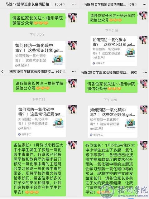 为进一步预防与减少学生一氧化碳中毒事件发生,保障学生生命安全,马院于1月28日-30日间在全院学生范围内利用“学习和预防一氧化碳中毒”网络主题班会、微信公众号推文、班级QQ群,学生家长群等多渠道开展多形式宣传教育。通过播放视频短片、抖音、推送防范信息等方式,让学生及家长了解风险隐患点,进一步地提升了同学们的自我保护意识,提高了应急、自救与保护的能力,并掌握安全防范措施。