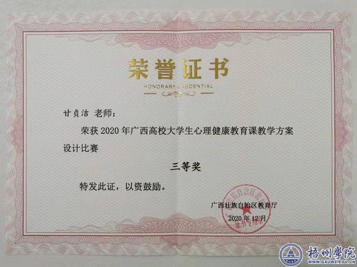 广西壮族自治区教育厅下发的《自治区教育厅关于公布2020年广西高校大学生心理健康教育教学方案设计比赛获奖名单的通知》(桂教思政〔2020〕23号),我校参赛教师甘贞洁2020年广西高校大学生心理健康教育课教学方案设计比赛三等奖。