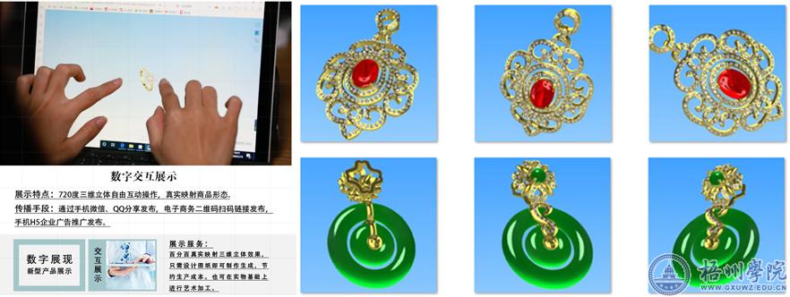 数艺专业《产品虚拟仿真设计》课程教学中,与梧州市施洛嘉华饰品有限公司共同指导学生进行实际案例制作,针对梧州人工宝石产业和梧州首饰设计产业,课程教学成果作业主要以三维交互设计产品的形式表现出来。