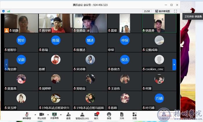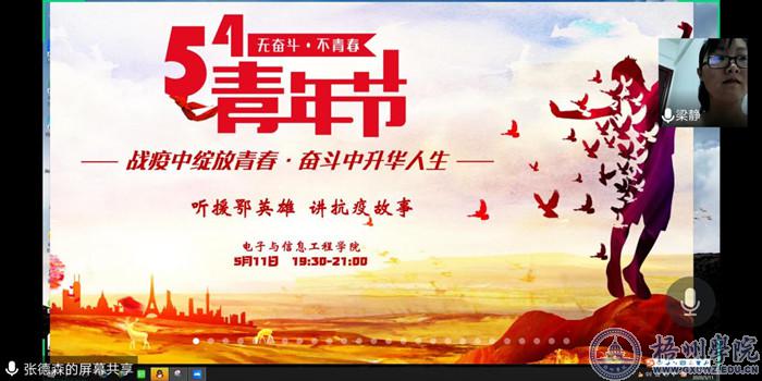 5月11日晚,电子与信息工程学院在腾讯会议APP开展“战疫中绽放青春·奋斗中升华人生”主题宣传教育活动,组织全体团学干部、团校培训班、青马培训班186名学生参加“听援鄂英雄,讲抗疫故事”分享会。