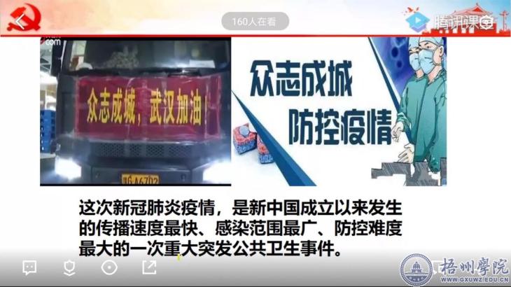 学院党委副书记韦翠兰老师以“悟初心、守初心、践初心”为主题,给同学们上了团校培训班的第一堂课。韦翠兰结合新冠肺炎疫情防控向同学们讲述了我国应对重大突发公共卫生事件的处理方式,在困难面前中国共产党如何践行初心,带领全国人民抗击疫情。在互动环节,同学们分享了想对在抗疫一线的工作人员们说的心里话,感谢默默地坚守在抗疫一线的广大工作人员。