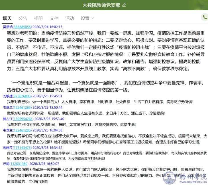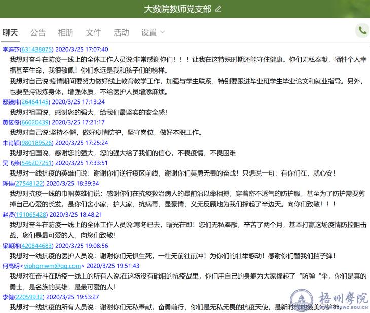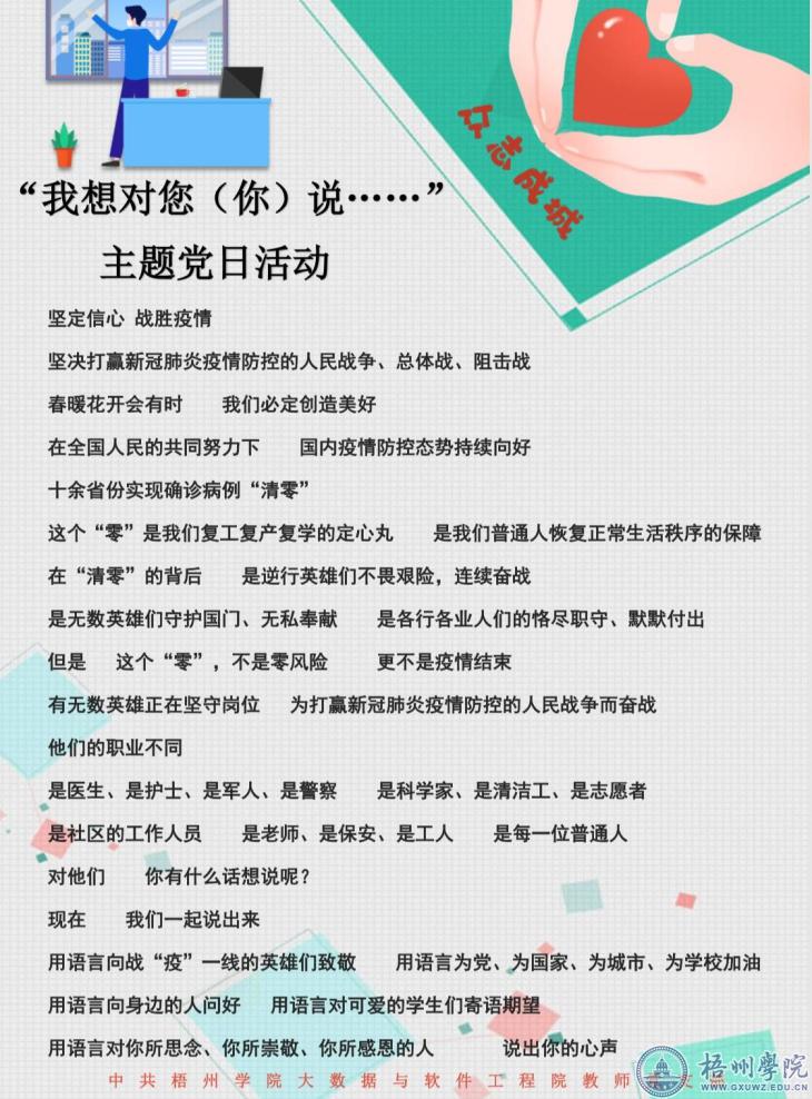 新冠肺炎疫情发生以来,大数据学院教师党支部全体党员深入学习贯彻习近平总书记关于疫情防控工作的重要指示精神,认真贯彻党中央、自治区和梧州市的各项通知要求,以及学校的各项工作部署,充分发挥基层党组织的战斗堡垒和共产党员的先锋模范作用,广大党员积极报名志愿者,踊跃捐款捐助,以实际行动积极支持疫情防控工作。近日,大数据与软件工程学院教师党支部开展党旗飘扬,共同战疫,“我想对您(你)说……”主题党日活动,教师党员积极分享战‘疫’期间心得体会,踊跃表达自己的所思所想,表明坚决打赢疫情防控阻击战的坚定信心。