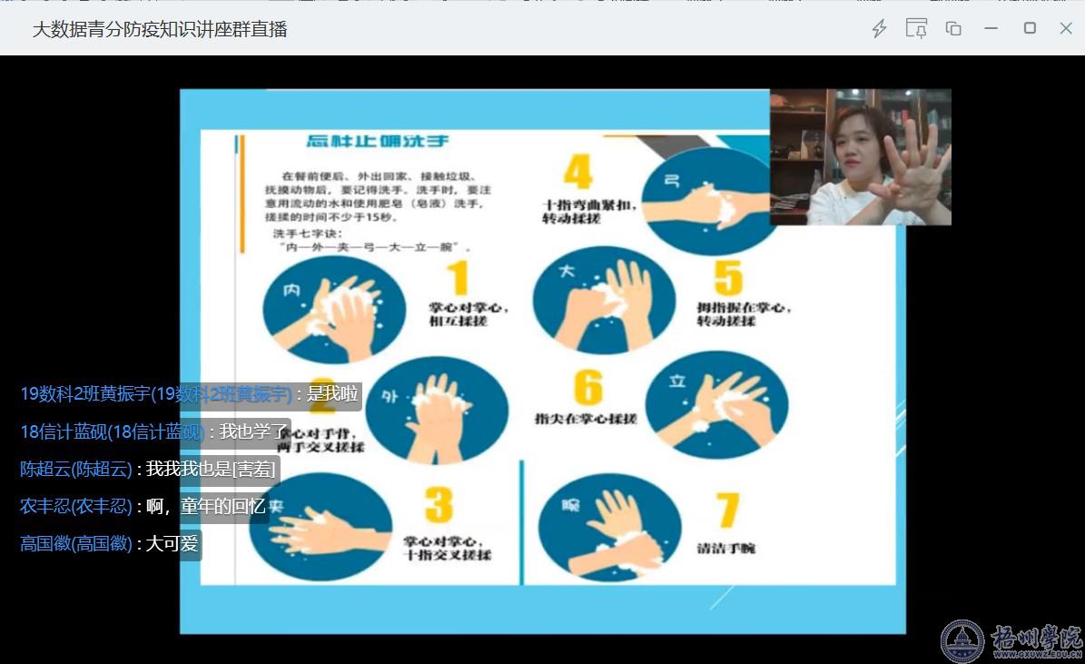 黄自桥主任从新冠病毒的特点、传播途径、临床特点、诊断治疗和新冠病毒的常见问题五个方面普及新冠肺炎疫情防控知识,提高学生防疫能力。俞罡副主任则结合同学们的实际情况,为大家详细讲解疫情期间的个人防护知识,并对七步洗手法、正确佩戴口罩方法进行了示教。