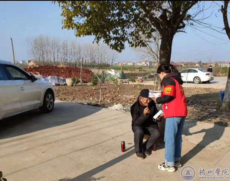 17制药2班周梅在湖北省荆州市监利县毛市镇上观庙村参加大学生志愿者疫情宣传服务队,负责在村内走访摸排、发放口罩、测量体温等工作。