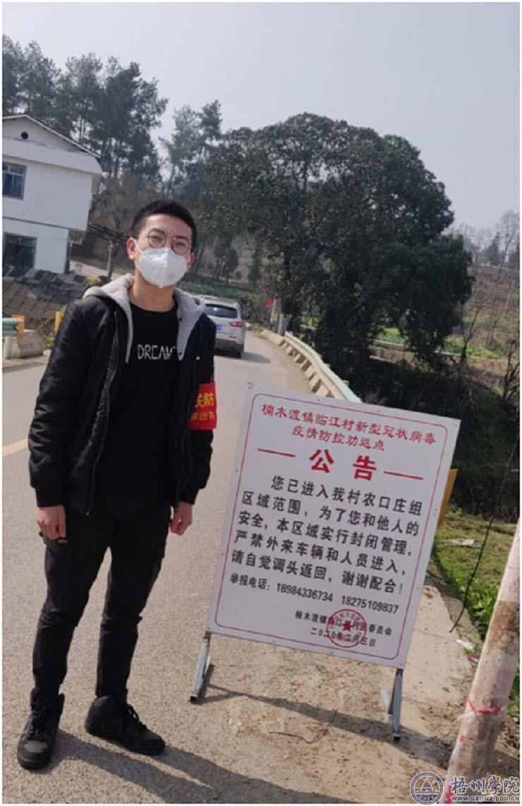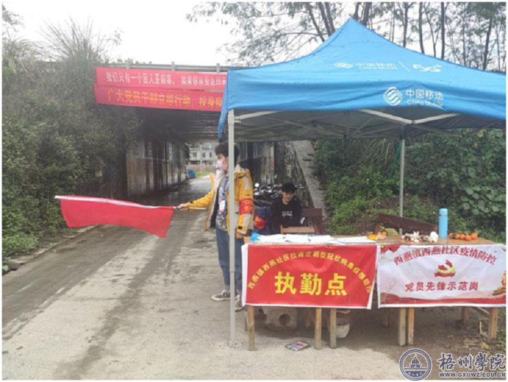 19机电2班黄凯斌在南宁市上林县西燕镇拉甫庄防疫执勤点站岗,他还参与了村道消毒等防疫工作。