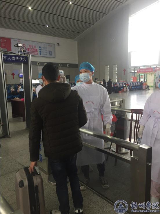2月14日,我院疫情防控党员服务队员陈燕、王河、陈驰宇等3名同志赴梧州南站协助医务人员进行体温检测工作。