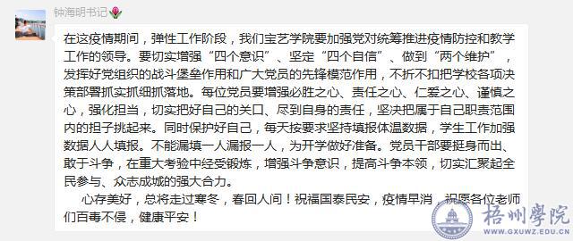 2月28日下午四点,宝艺学院教师党支部通过党员微信群召开“疫情防控,人人有责”网络党日活动,全体党员参加了活动。