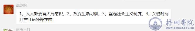 本次党日活动的内容主要围绕三个方面展开:一是党员自学习近平关于抗击疫情的重要指示和自治区、学校有关的文件精神后发表个人感想。二是分享党员个人了解到的当地疫情情况及当地防控疫情经验。三是鉴于目前的特殊情况,对我院在教学、学生管理等方面提出有效建议。