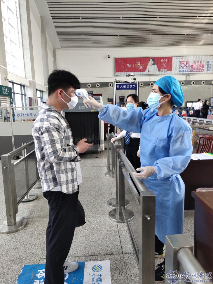 大数据与软件工学院党委响应梧州市和学校关于进一步落实新型冠状病毒感染的肺炎疫情体温检查站联防联控工作通知精神。3月9日,大数据与软件工程学院疫情防控志愿服务队员黄宏本、韦翠兰到梧州南站动车入口处协助医务人员进行体温检测工作。