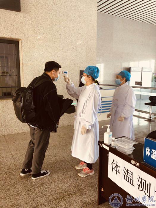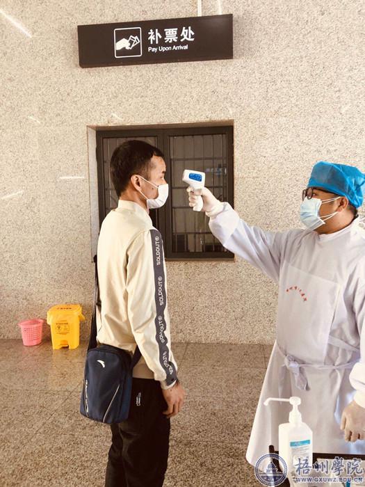 2月14日,文学与传媒学院疫情防控党员服务队在梧州南站对旅客进行体温检测。