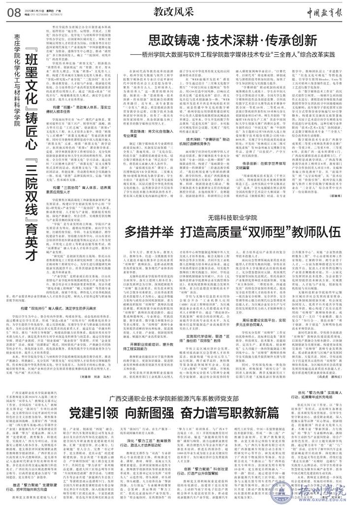数字媒体技术专业获广西教学成果奖二等奖1项和各类教学竞赛广西一等奖2项、二等奖5项、三等奖6项,获批广西一流本科课程1门、广西高校课程思政示范课程2门、广西课程思政教学团队、广西高等教育教学改革工程项目8项、教育部门产学合作协同育人项目3项,主编和参编立体化教材7套。从“前端开发”到“元宇宙构建”,从“技术应用”到“价值引领”,梧州学院大数据与软件工程学院数字媒体技术专业在“三全育人”综合改革中交出了一份亮眼的答卷。