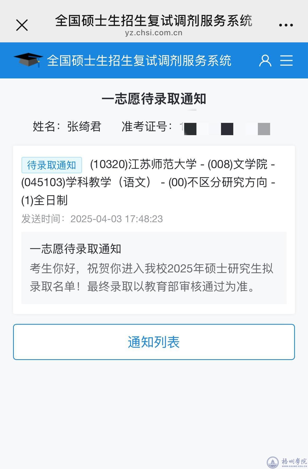 张绮君考研拟录取通知