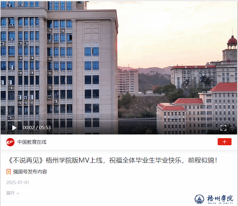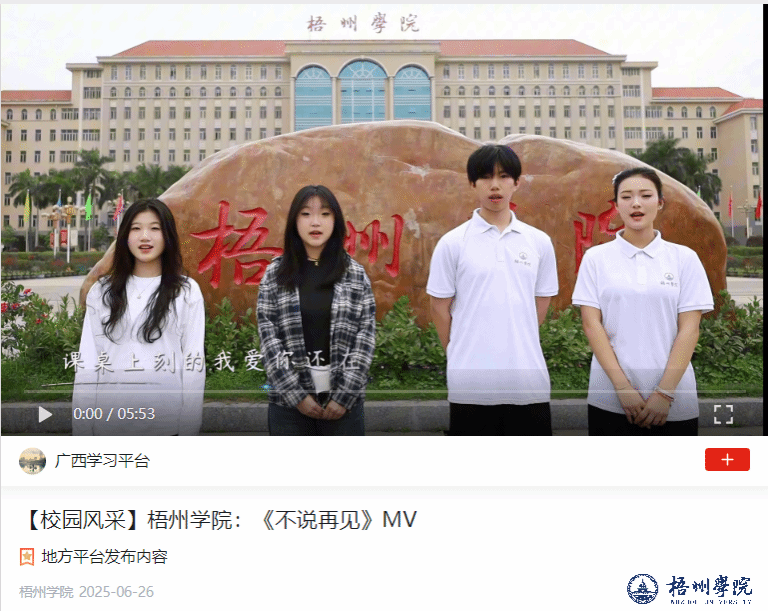 近日,由我校党委宣传部制作毕业季献礼原创MV视频《不说再见》被学习强国的“中国教育在线“”广西学习平台“转载。该视频由邓小林监制,梁志慧制片,黎紫晴、马庆斌、黄宏威、朱军军、韦懿真、邹慧香、刘佳艳、严燕拍摄,黎紫晴、马庆斌、黄宏威剪辑,李炫燃、文川文、赵晨雯、张佳珩、覃俊贵出镜演唱,李典混音制作。歌曲旋律悠扬动人,歌词中满是对校园时光的眷恋、对同窗情谊的珍视以及对未来的憧憬与期盼。MV通过镜头捕捉了校园里的一草一木、课堂上的专注身影、操场上的青春活力、毕业季的欢笑与不舍等诸多珍贵瞬间,将毕业生们的共同记忆浓缩其中。