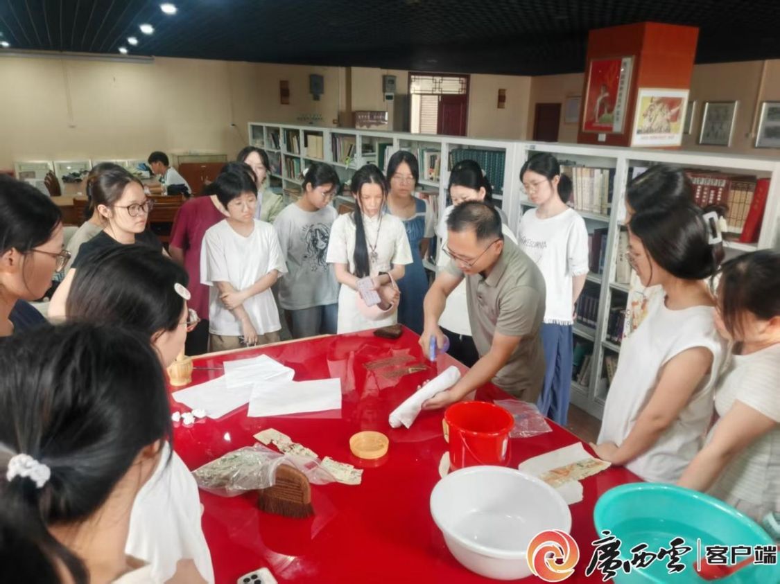 “文献修复与书法装裱同源,其核心在于托底与装裱工艺的精妙运用。”授课教师、梧州学院西江流域民间文献研究中心常务副主任陈宇思博士表示,希望通过沉浸式的实践教学,让学生更深入理解非物质文化遗产的传统内涵;同时借助文献修复这一独特视角,引导青年群体了解古代纸张工艺的精巧与美学,从而激发他们对中华优秀传统文化的敬畏与热爱。