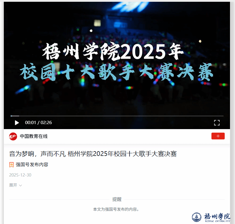 12月27日晚,我校举办的“音为梦响,声而不凡”2025年校园十大歌手决赛。由宣传部部出品,冷靖、 刘佳艳 、余秋霞、朱开洲、黄佳雪、巩建茜、 陶修宇、李鈺芳、邬涵宇等同学拍摄制作的视频《音为梦响,声而不凡 梧州学院2025年校园十大歌手大赛决赛》被“学习强国”平台转载。该视频以细腻镜头捕捉决赛精彩瞬间,全方位展现了参赛学子的演唱才华与青春活力,生动传递了校园文化的独特魅力。