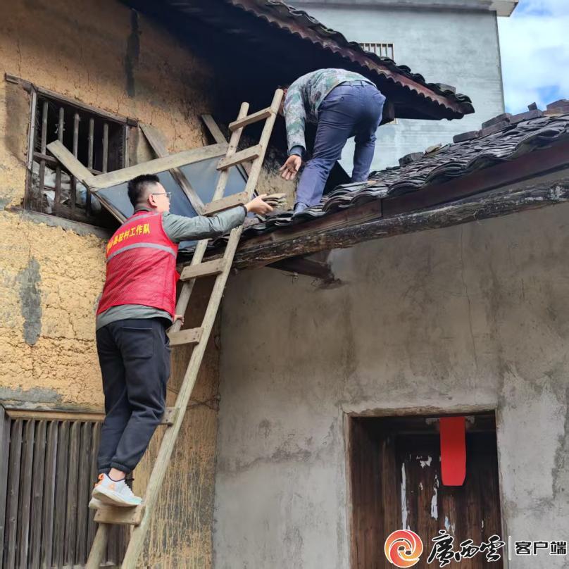 六桂村驻村第一书记徐超帮助脱贫户更换瓦片。校方供图