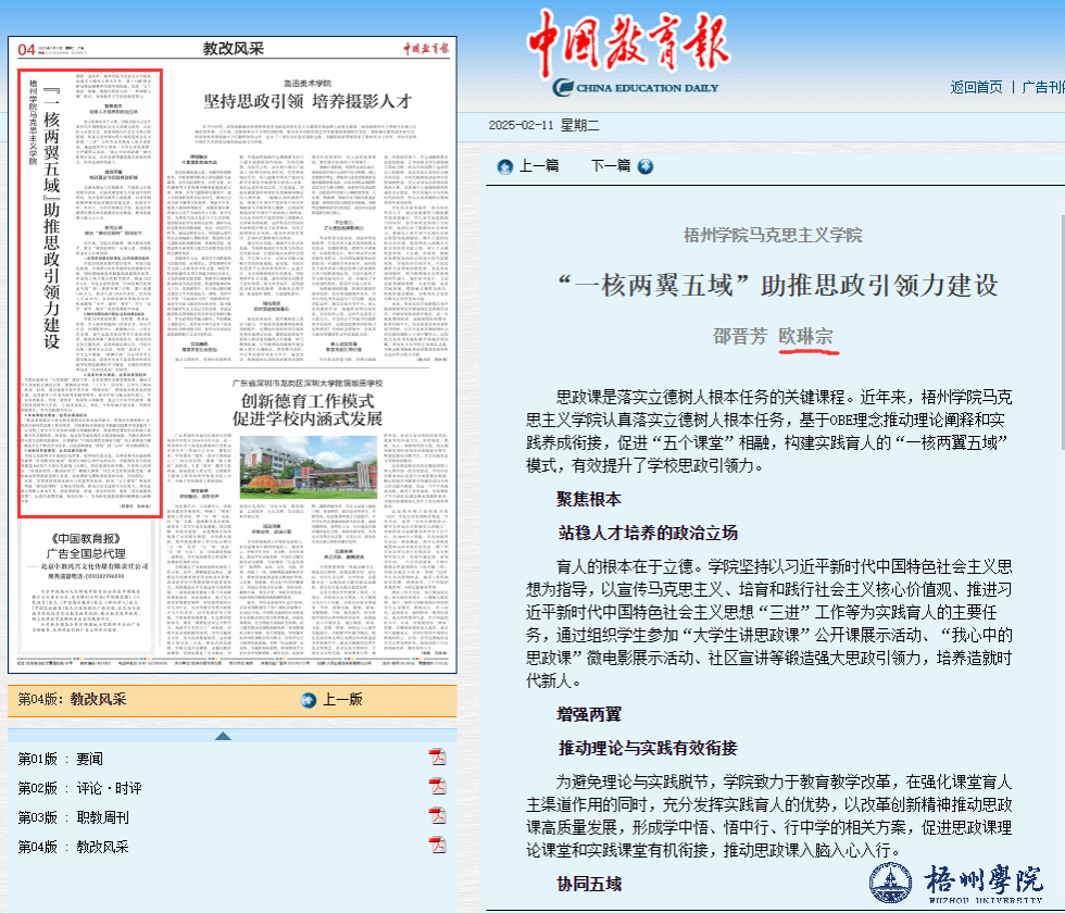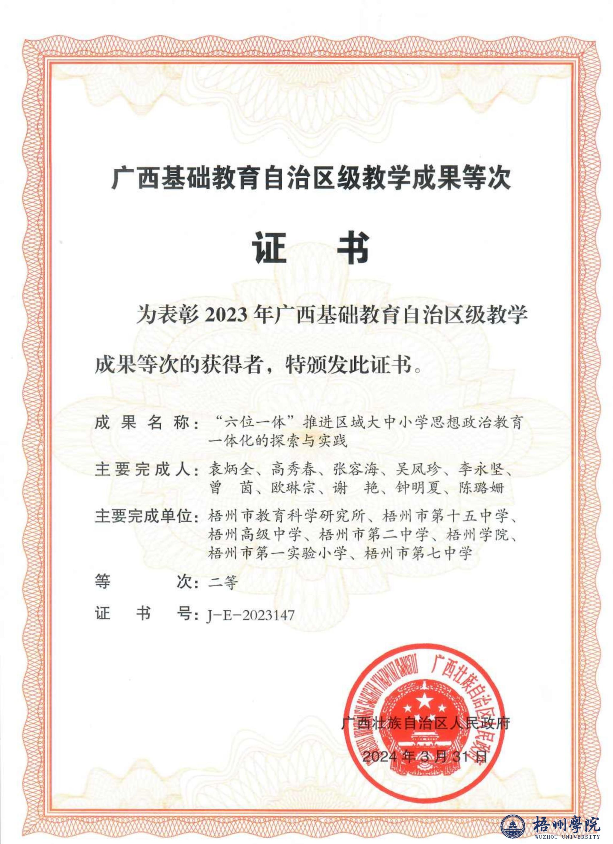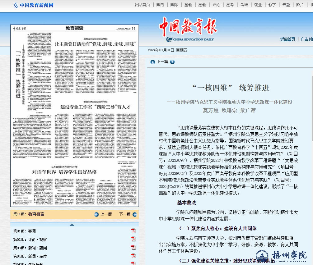 深耕结硕果,实干出成绩。学院斩获市级基础教育成果奖一等奖3项、自治区基础教育成果奖二等奖1项,相关创新实践成果4次登上《中国教育报》,向全国展示梧州思政教育一体化建设的特色做法,让梧州学院的思政育人影响力不断扩大。