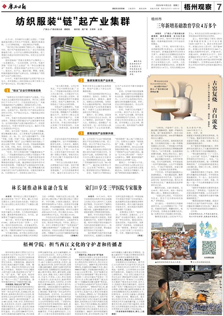 梧州学院认真学习贯彻习近平文化思想和习近平总书记关于广西工作论述的重要要求,立足西江流域地域文化,主动承担传承发展西江文化的责任与使命。对散落民间、濒临失传的西江流域文献进行抢救、收集、整理、研究,将地方优秀传统文化与美育工作相融合。将流传千年的古籍嵌入现代流行元素,推动传统文化“留”下来、“活”起来、“潮”起来,推进传统文化创造性转化、创新性发展。为服务“珠江——西江”经济带建设,谱写中国式现代化广西篇章贡献力量。