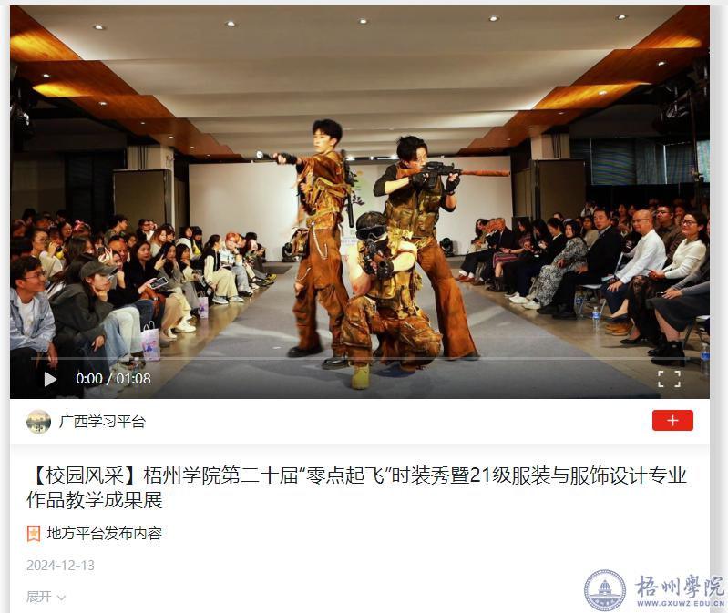 下一条:[学习强国]梧州学院举办第二十届“零点起飞”时装秀暨21级服装与服饰设计专业作品教学成果展