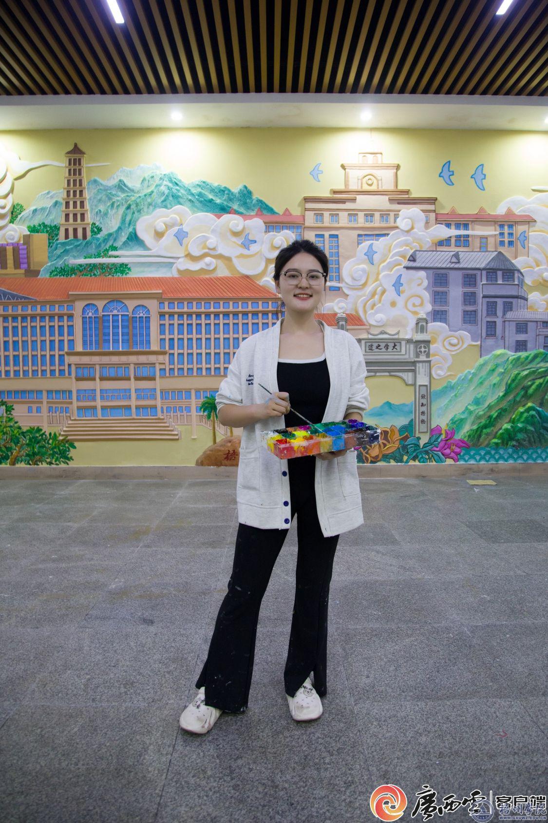“母校把我放心上,我把母校绘墙上。”谈起此次创作,裴一凡充满自豪。她毕业于梧州学院宝石与艺术设计学院2017 级视觉传达设计专业,其团队的作品在2024年曾获外交部发言人在海外平台“点赞” 。裴一凡介绍,过去的一年,她辗转全国多地进行壁画创作,不断提升技艺,未来也将继续努力精进技术。