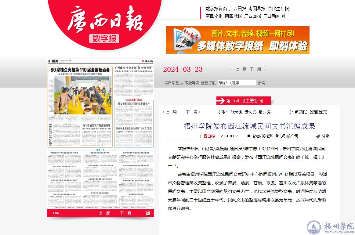 3月19日,梧州学院西江流域民间文献研究中心举行服务社会成果汇报会,发布《西江流域民间文书汇编(第一辑)》一书。