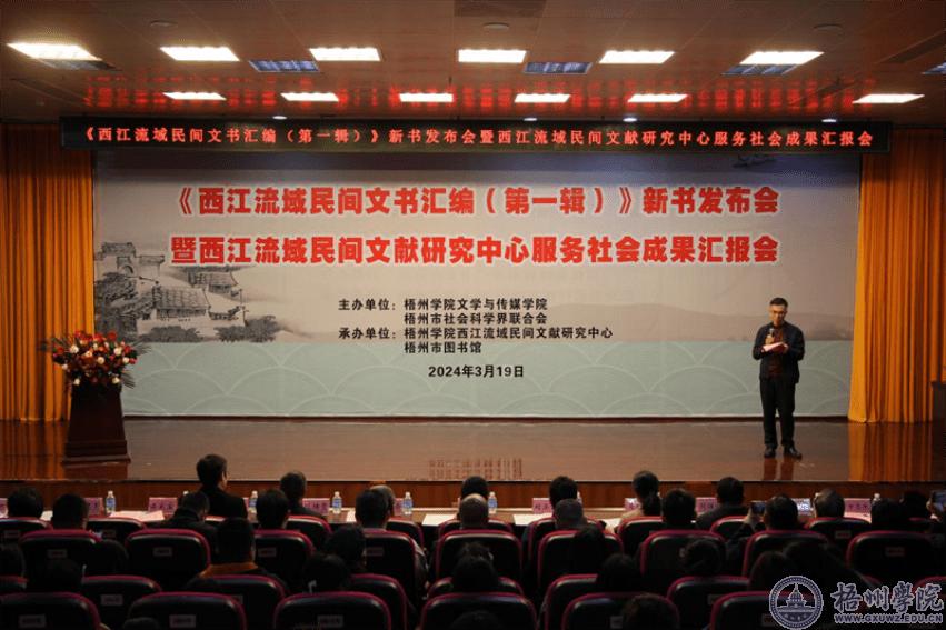 3月19日,由梧州学院文学与传媒学院、梧州市社会科学界联合会共同主办,梧州学院西江流域民间文献研究中心与梧州市图书馆联合承办的《西江流域民间文书汇编(第一辑)》新书发布会暨西江流域民间文献研究中心服务社会成果汇报会在梧州市图书馆举行。梧州学院校长、西江流域民间文献研究中心主任杨奔,梧州市委常委、宣传部部长黄恩出席发布会,并分别作讲话。