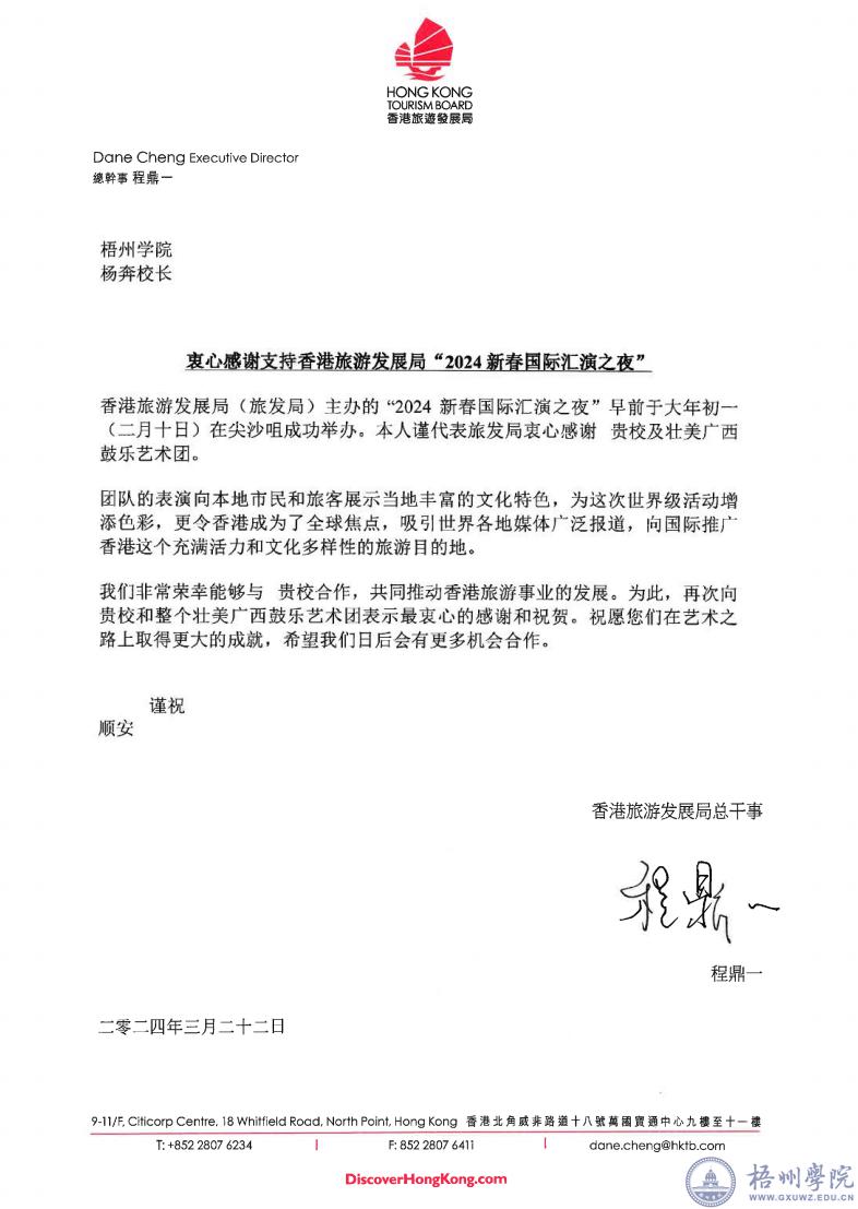 “团队的表演向本地市民和旅客展示当地丰富的文化特色,为这次世界级活动增添色彩,更令香港成为了全球焦点,吸引世界各地媒体广泛报道,向国际推广香港这个充满活力和文化多样性的旅游目的地”。近日,梧州学院杨奔校长收到一封来自香港旅游发展局总干事程鼎一的感谢信,信中对学校派出艺术团参加香港旅游发展局“2024新春国际汇演之夜”演出活动表达感谢之情。