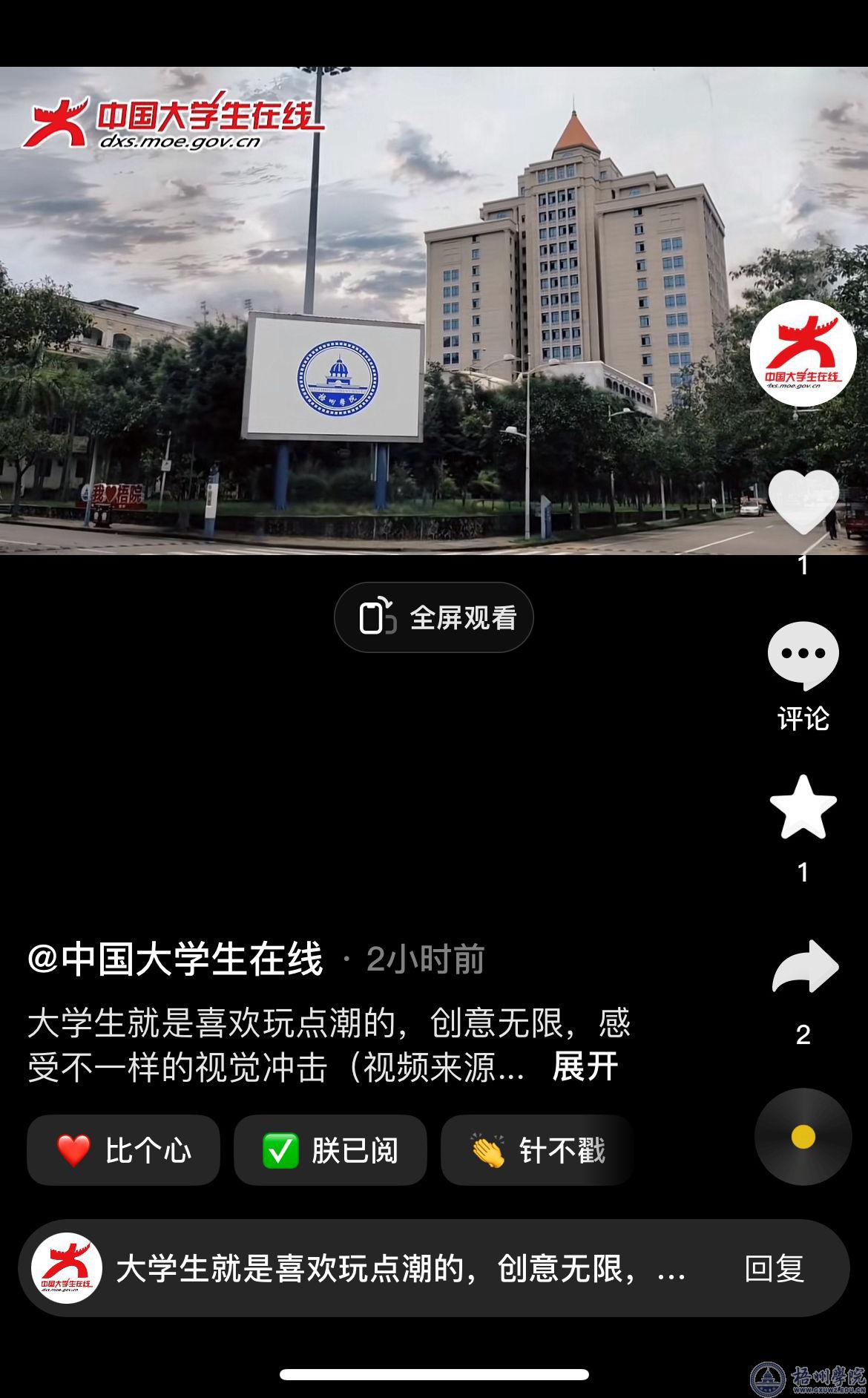 由宣传部制作,梁志慧老师指导,韦懿真拍摄,马庆斌剪辑,樊蓝敏出境的视频《大学生就是喜欢玩点潮的》被“抖音”的“中国大学生在线”平台转载刊播。该视频以梧州学院校园为背景,运用技术处理,创意无限,给人感受不一样的视觉冲击。
