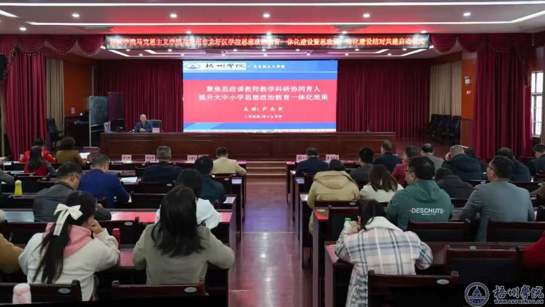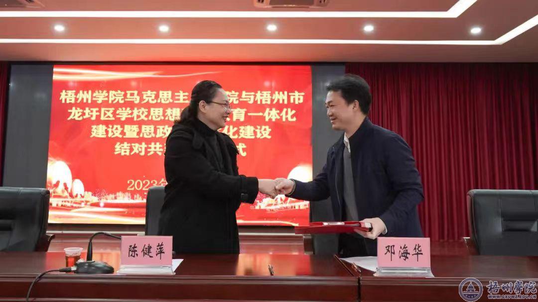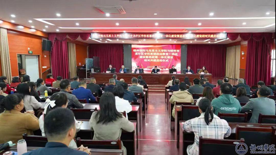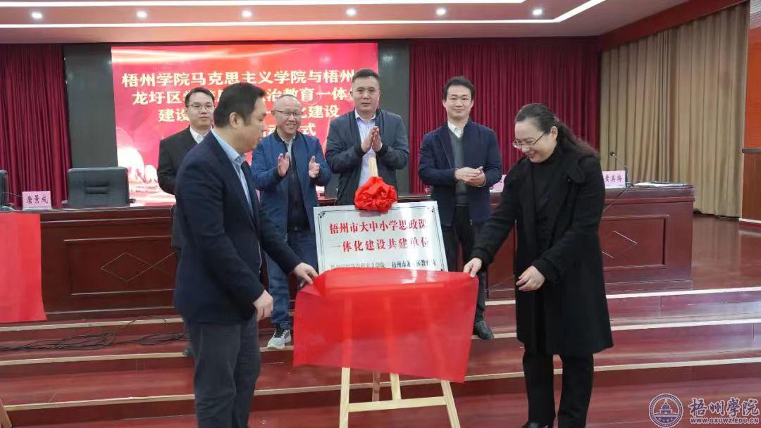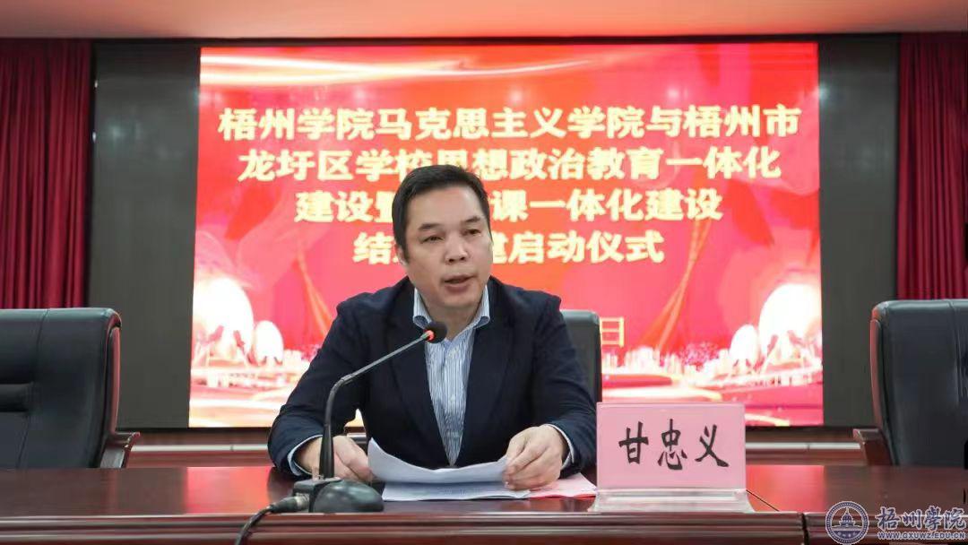 12月8日,梧州学院马克思主义学院与梧州市龙圩区学校思想政治教育一体化建设暨思政课一体化建设结对共建启动仪式在梧州市苍海小学举行。龙圩区委常委、副区长甘忠义,梧州学院马克思主义学院院长陈健萍出席启动仪式。
