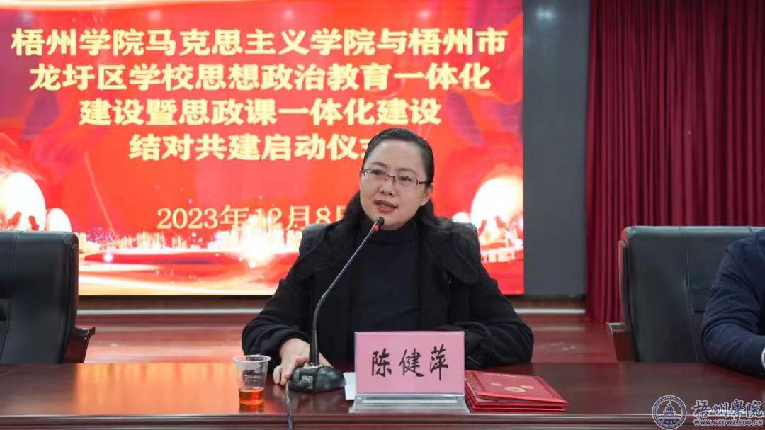 陈健萍在致辞中指出,本次结对共建,有利于提升梧州市思想政治教育高端人才自主培养能力,共同推动梧州市大中小学思想政治教育一体化建设工作。希望双方以本次合作共建为契机,聚焦育人根本任务,扎实推进共建工作;立足各自职责,打造建设命运共同体;秉承共赢理念,强化双方合作交流,不断增强龙圩区思想政治工作实效,夯实龙圩基础教育高质量发展基础,努力办好人民满意的教育。